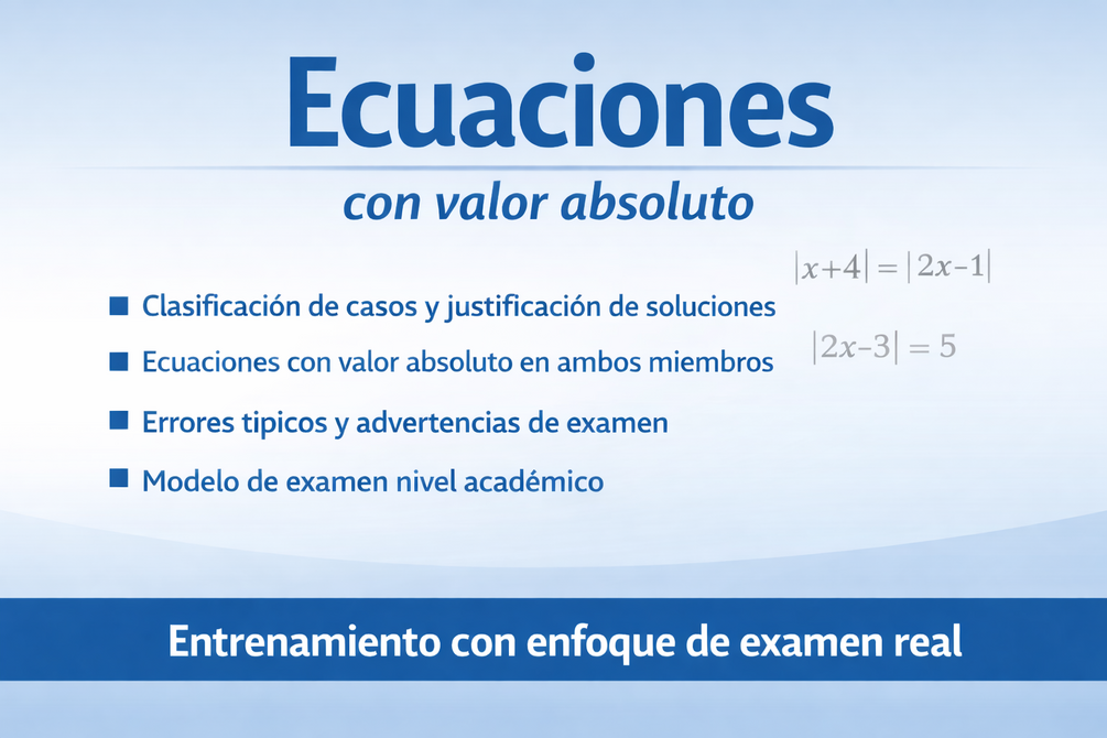 Este PDF desarrolla el tratamiento completo de las ecuaciones con valor absoluto desde una perspectiva estrictamente académica y orientada a examen. El enfoque no se centra en técnicas mecánicas, sino en el análisis correcto de casos, la verificación de soluciones y la justificación de resultados.